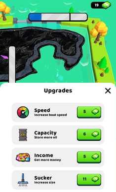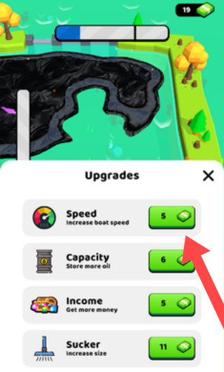 1、界面上方可见被污染的水域场景,下方菜单中包含多个升级选项,体现出游戏中通过资源提升角色相关能力以更好完成海洋清理任务的玩法。