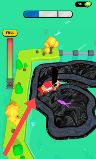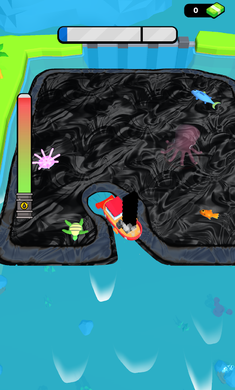 2、玩家操控着一艘小船在被污染的黑色水域中,周围有一些彩色图案(可能是污染物质或海洋生物)进行清理。