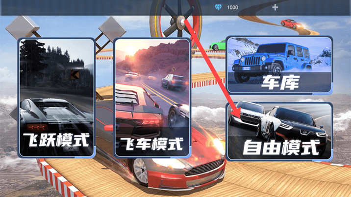 2、开始游戏前可以看到有个车库区域,你也可以在车库中选购一辆爱车,然后点击一个模式开始进入驾驶操作。