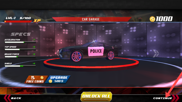 1、进入飞车追逐驾驶模拟器游戏封面后,你需要点击右下角【CONTINUE】的按钮,然后进入游戏。