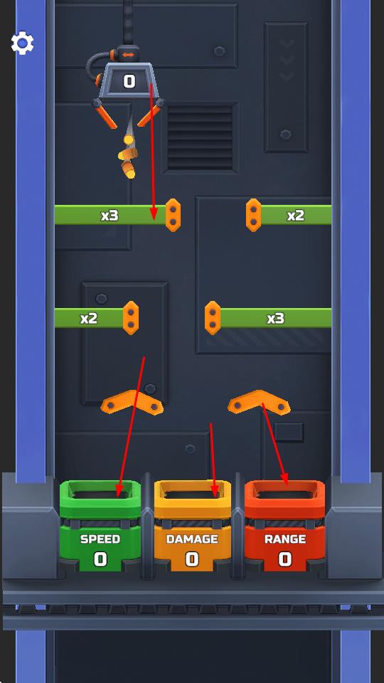 1、游戏开始之前将子弹扔下,通过各种加倍获得更多的子弹,落下的子弹会掉落到下面3个属性桶,给予属性加成。