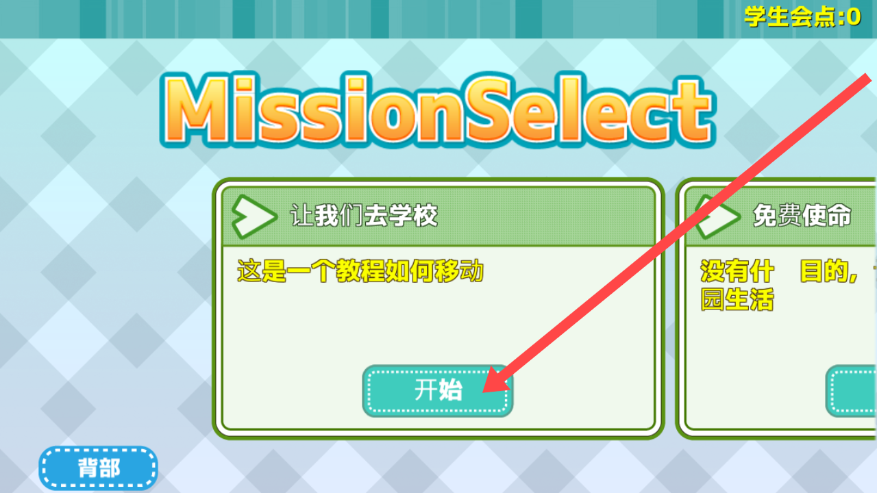1、在MissionSelect界面,选择让我们去学校任务,点击【开始】按钮,进入教程。
