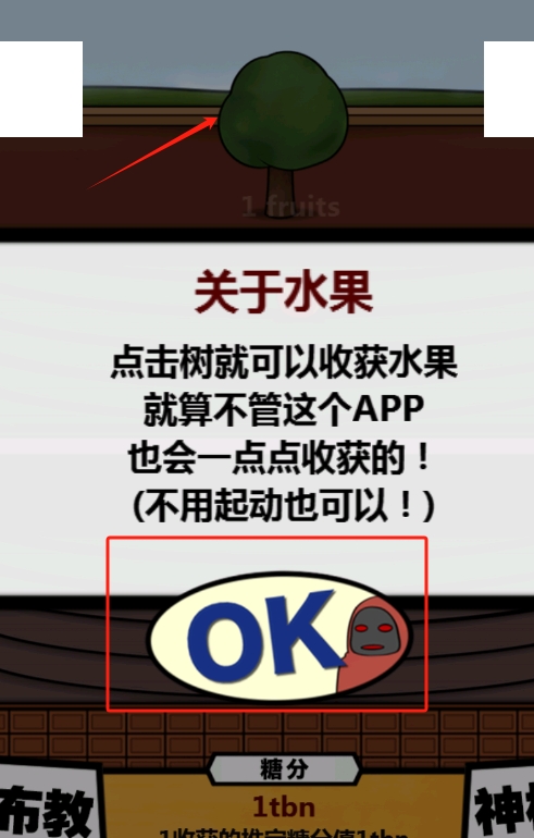 2、确认知晓点击果树可收获水果,且APP在后台也能自动收获这一机制。