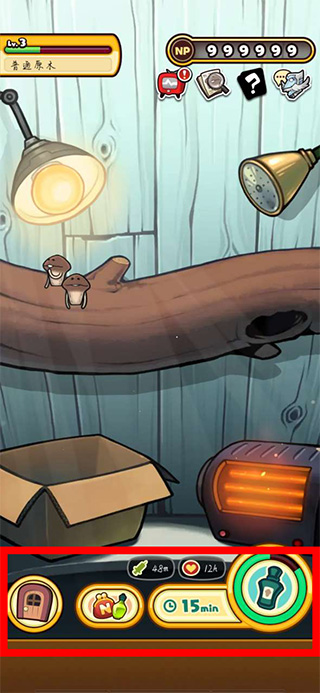 1、下方的物品栏为菇菇食物,菇菇食物右下方为所需的生长时间,手指滑过菇菇就可以收成。