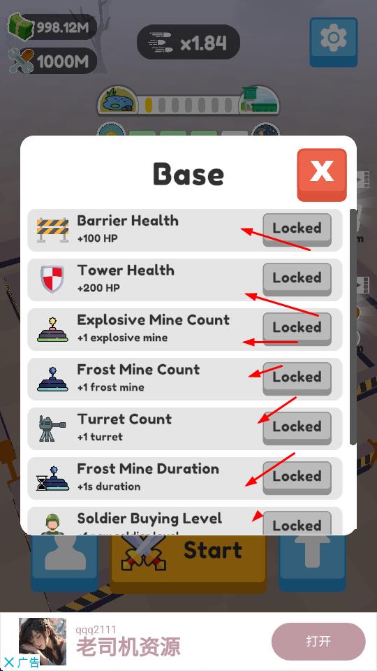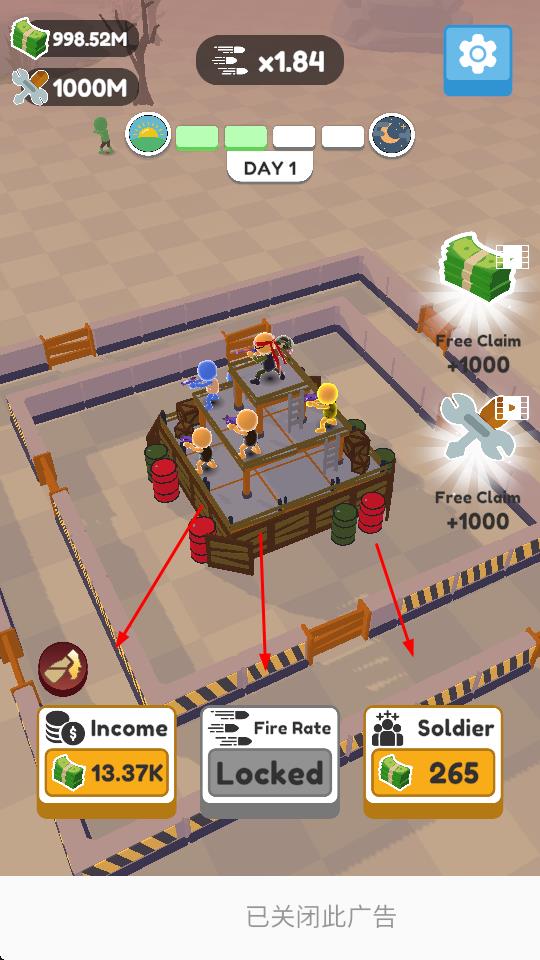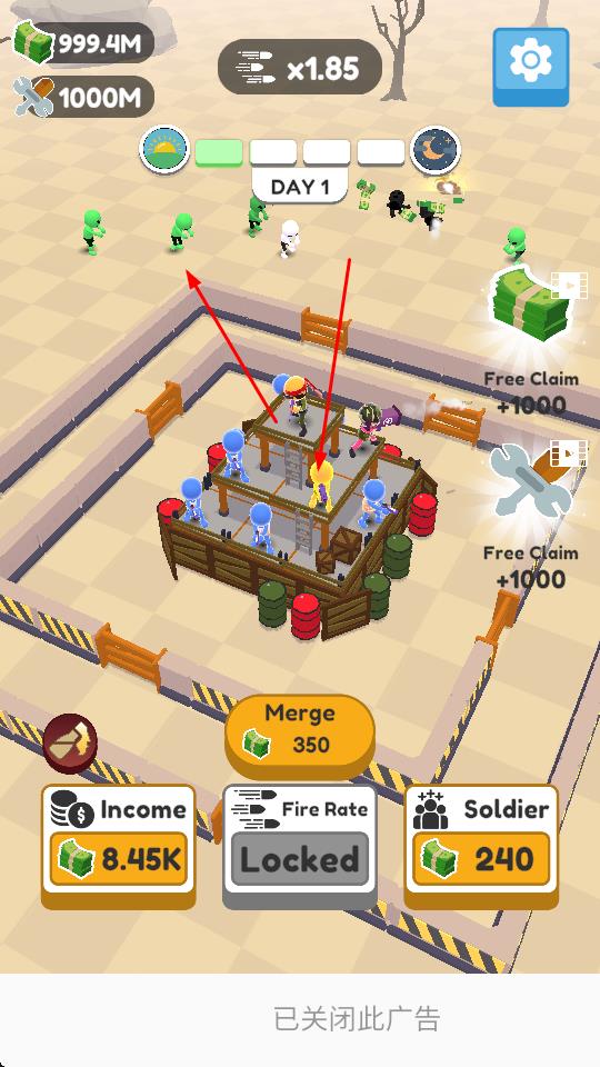2、作战过程中可以使用钞票来升级下方3个属性,可以招募士兵,合成相同士兵,来增加战斗力。