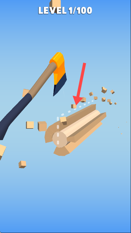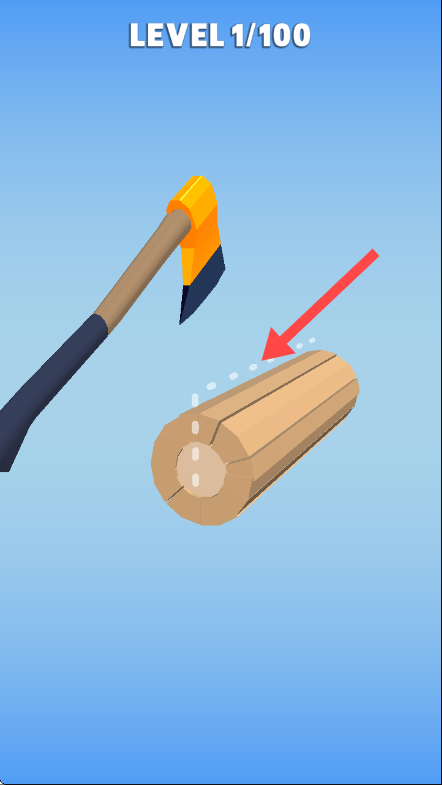 2、进入【LEVEL1/100】关卡,按箭头指示对准原木准备砍伐操作。