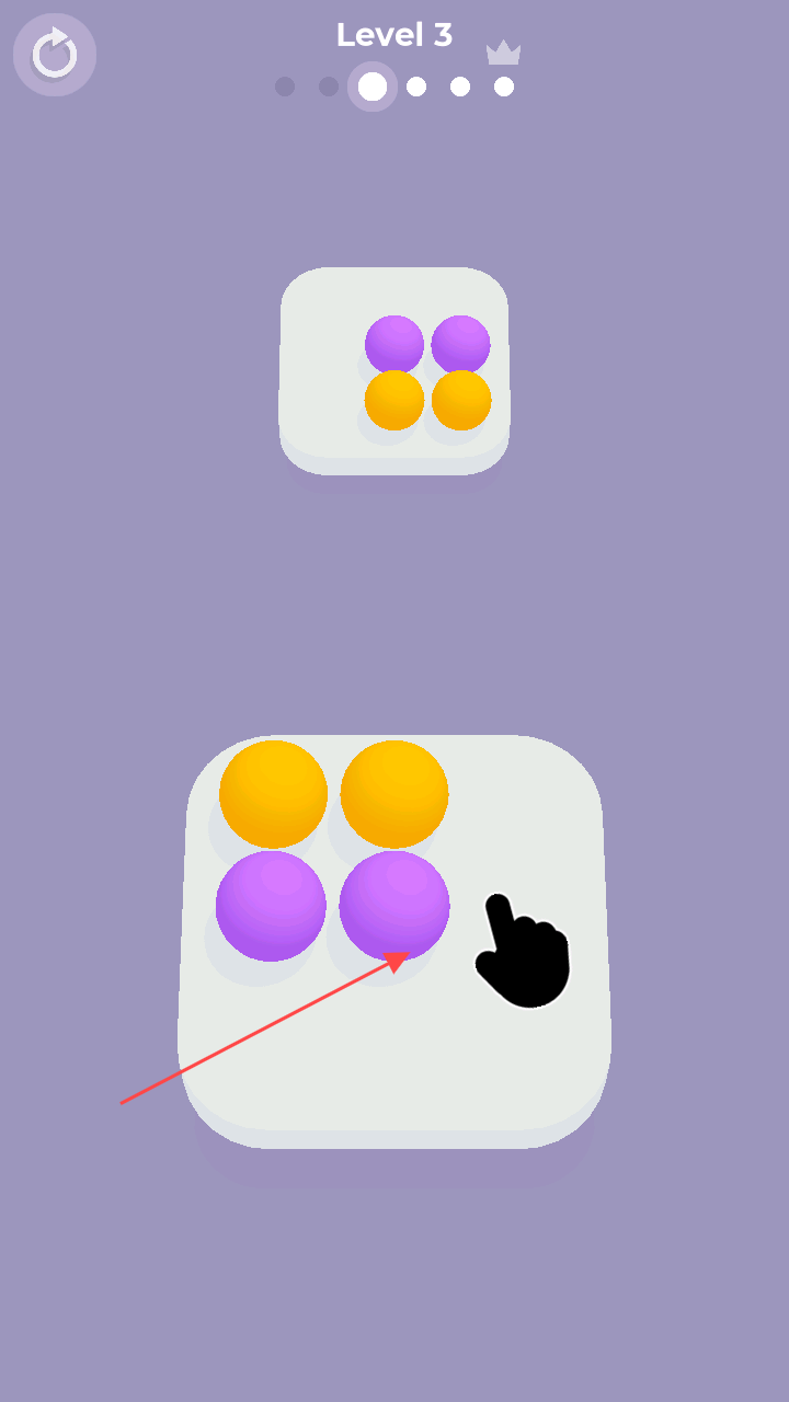 3、在【Level3】界面中,按箭头指示点击紫色球,通过调整小球位置完成当前关卡的拼图任务。