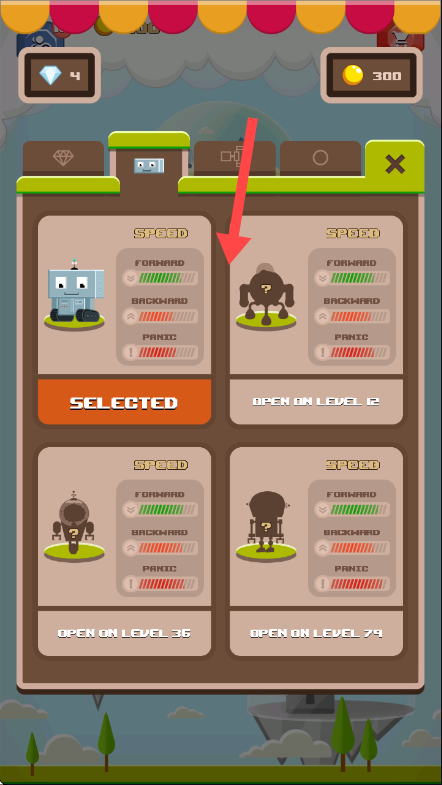 2、进入机器人选择界面,按箭头指示选择相应机器人,查看其【SPEED】等属性。