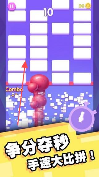 1、进入游戏界面,根据【争分夺秒手速大比拼!】提示,操控角色按红色箭头方向点击方块,通过快速点击提升【Combo】连击数,获取高分。