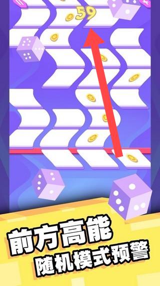 3、遇到【前方高能随机模式预警】界面,按红色箭头指示关注数字(如59),在随机出现的金币和方块布局中,快速点击获取金币,应对随机模式挑战。