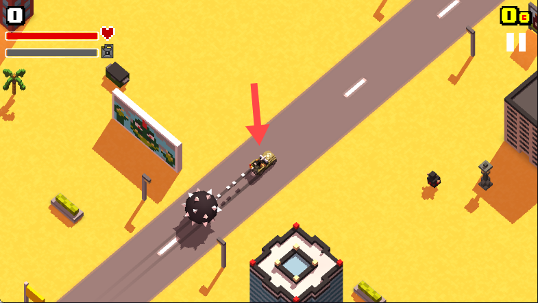 3、操控车辆拖着带刺的球在道路上行驶,注意观察周围环境,躲避障碍并利用带刺球撞击目标,获取游戏分数。
