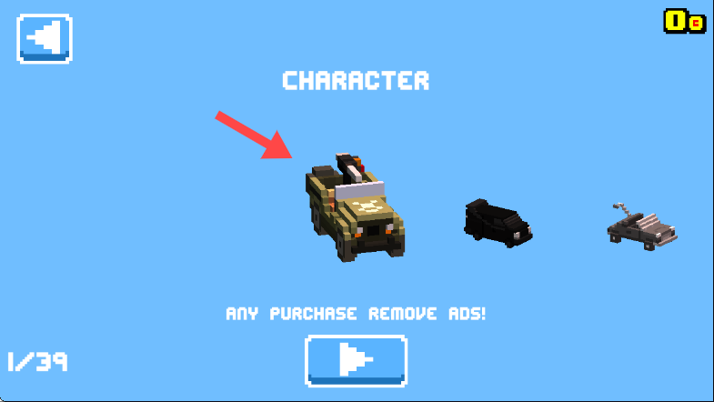 2、在【CHARACTER】界面中,选择箭头所指的车辆,点击确认按钮,完成角色车辆的选定并开启游戏。