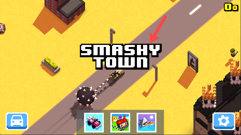 1、游戏初始界面显示【SMASHYTOWN】,下方有车辆图标,点击选择心仪的车辆进入游戏环节。