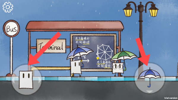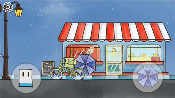 1、移动与躲避操作:通过左边摇杆灵活控制一张纸移动,在车辆驶来、雨水飞溅时,及时操控角色躲入商店,或用右边摇杆控制雨伞遮挡雨水。