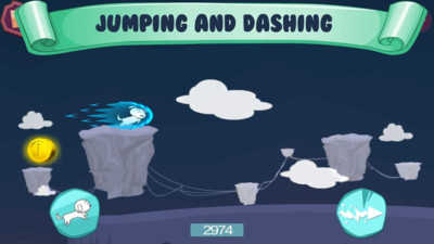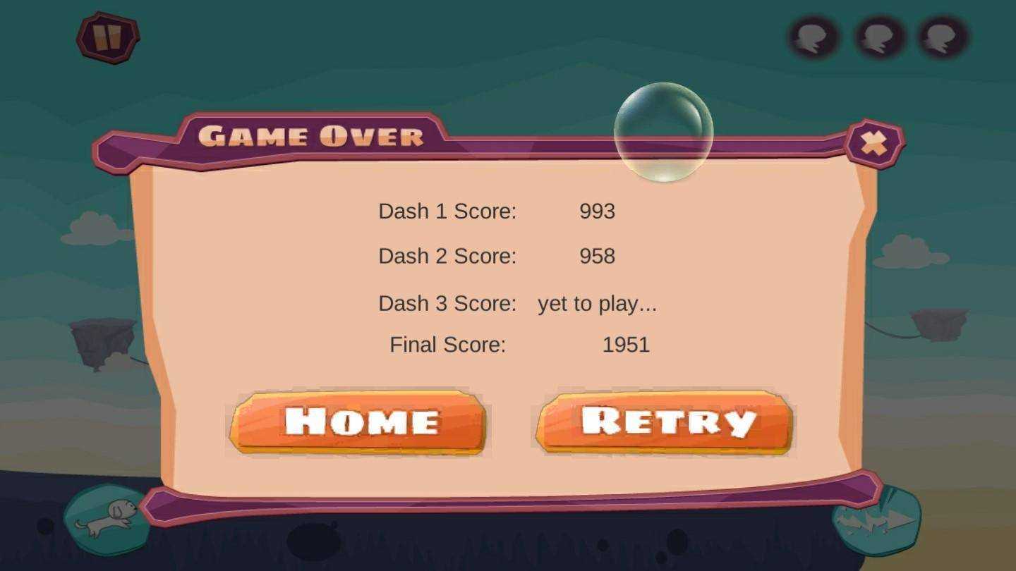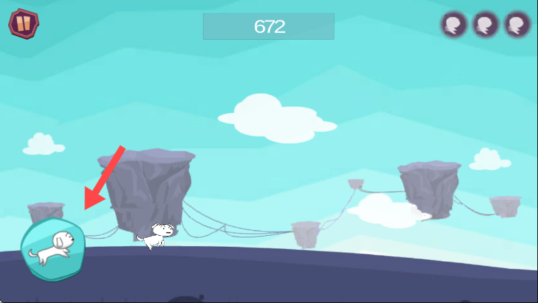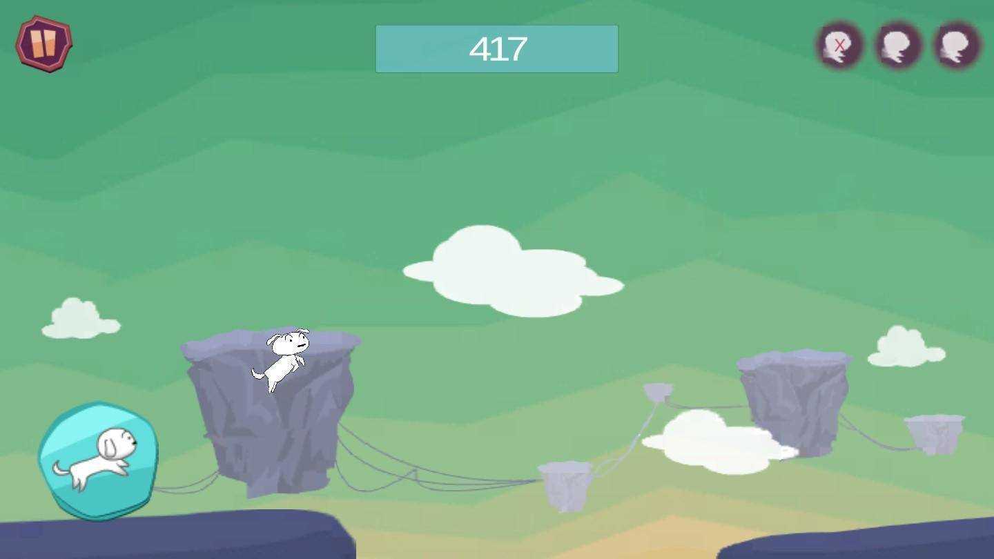 2、游戏点击左下角带有小狗图案的图标,控制小狗跳跃,躲避前方的平台障碍。