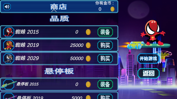 2、进入商店后,先将免费的【蜘蛛2015】角色与【悬停板2015】【装备】,后续再用金币购买高级道具。
