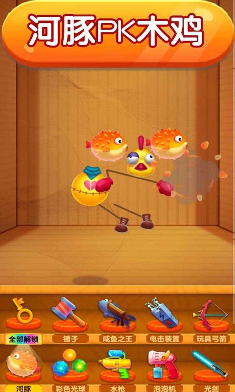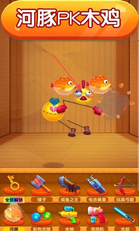 1、游戏界面下方有多种道具,像锤子、咸鱼之王等,玩家可选择不同道具对木鸡进行攻击,每种道具可能有独特攻击效果。