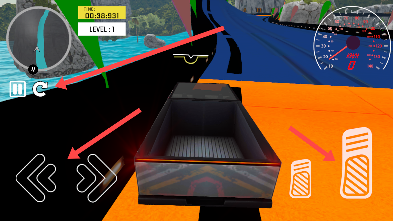 3、如图按键分别有暂停,重新开始,左右方向控制,右边区域则是刹车踏板和油门踏板。