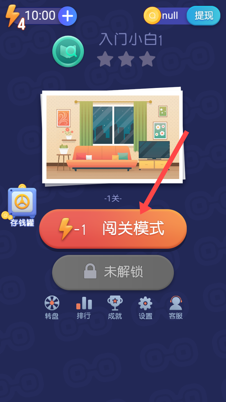 1、在游戏首页点击【闯关模式】按钮,如箭头所示,开启关卡挑战,进入游戏环节。