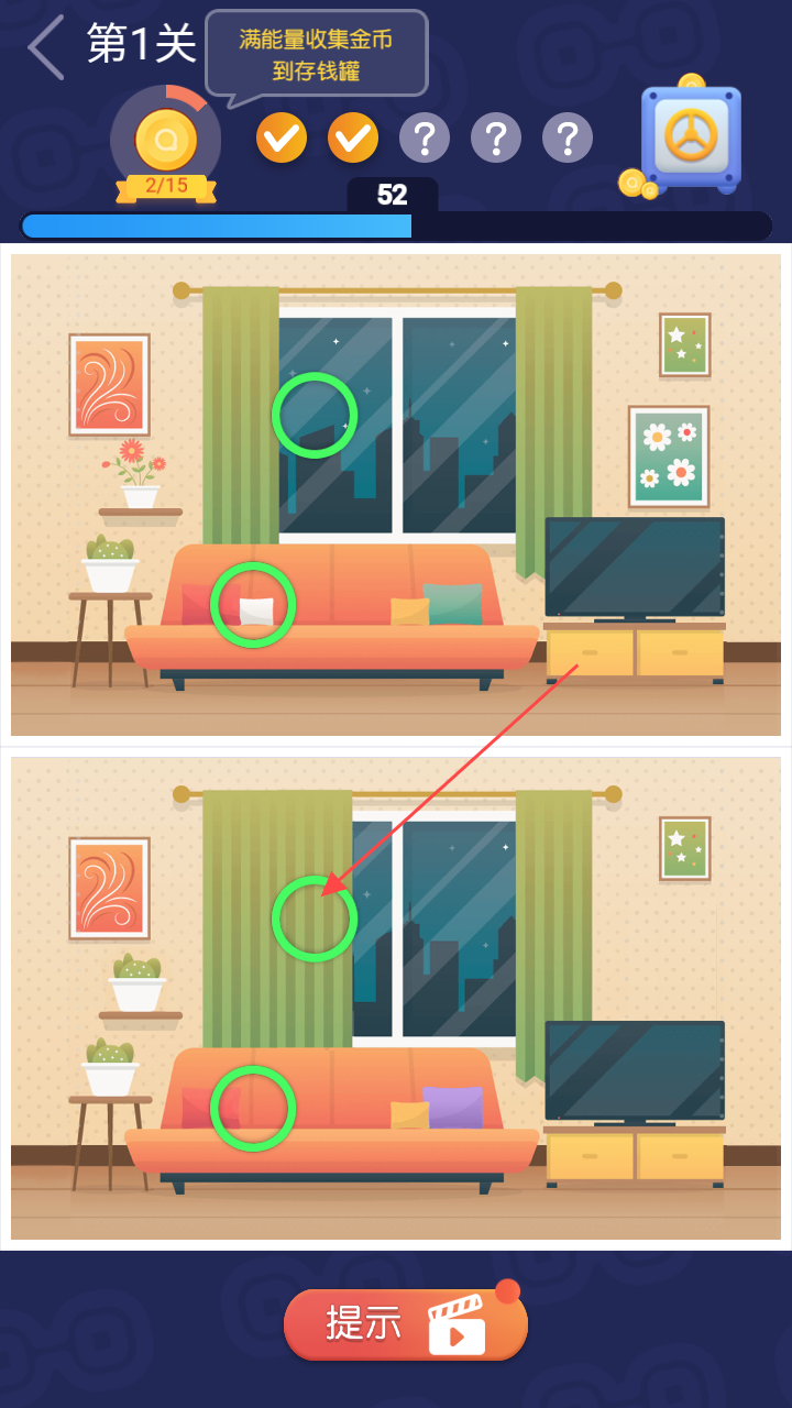 2、进入第1关后,按提示操作,观察画面差异,完成关卡任务,推进游戏进程。