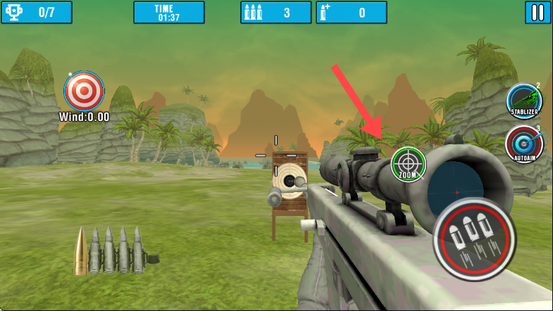 3、进入游戏场景后,通过瞄准镜观察,调整瞄准进行射击,同时关注【TIME】和弹药数量,完成目标任务。