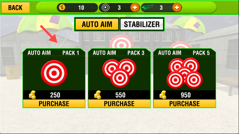 2、在功能选择界面,可选择【AUTO AIM PACK 1】等礼包进行购买,利用自动瞄准功能提升射击精准度。