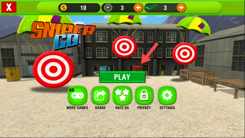 1、游戏初始界面点击中间绿色的【PLAY】按钮,即可进入游戏开始狙击挑战。