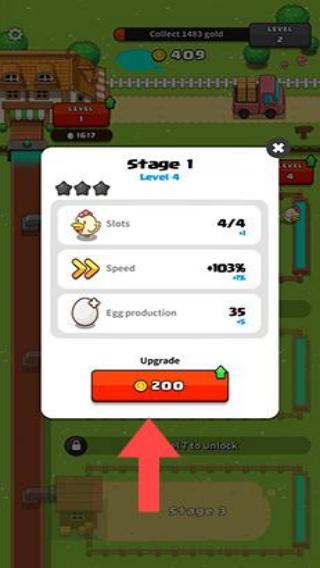2、遇到升级界面时,若资源足够,点击【箭头】指向的【Upgrade】按钮,花费200金币提升关卡属性,增强收益。