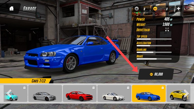 3、当金币存够一定数量,返回主页面点击GARAGE车库,就可以选购解锁你喜爱的车型。