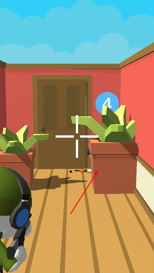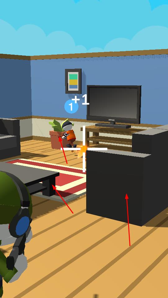 3、玩家可在不同室内场景移动,搜索并射击敌人,像从门口区域移动到客厅区域进行射击。