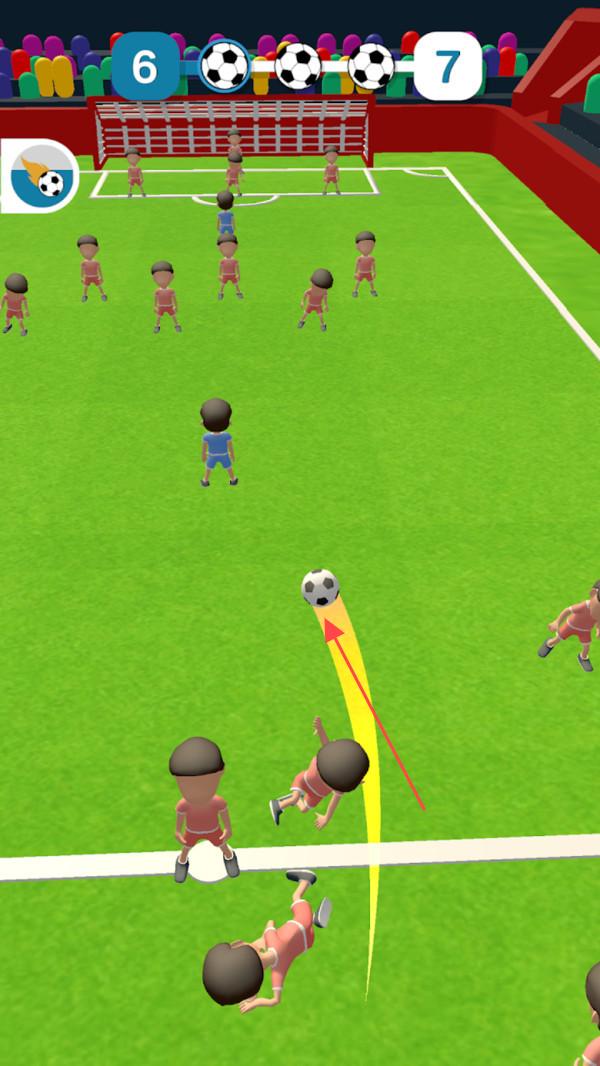 1、在游戏中操控足球,按箭头指示方向移动,巧妙避开对方球员拦截,推进球的位置。