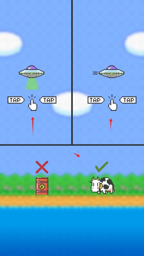3、音效氛围沉浸:复古电子音效与UFO飞行的蜂鸣声动物的叫声障碍的警示音相得益彰,成功抓取时的提示音与失败时的爆炸音效,增强操作的反馈感。