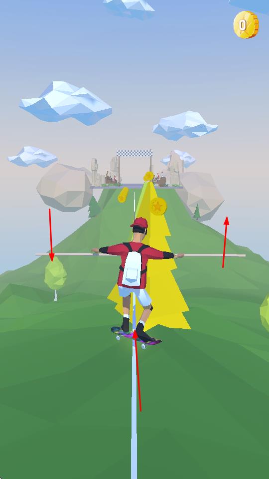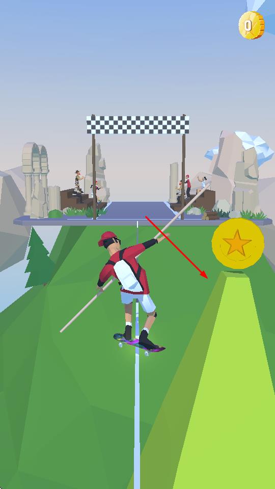 1、玩家操控角色在赛道上滑滑板前进,通过倾斜手机或操作虚拟按键控制角色左右移动,以保持在赛道内并顺利前行。