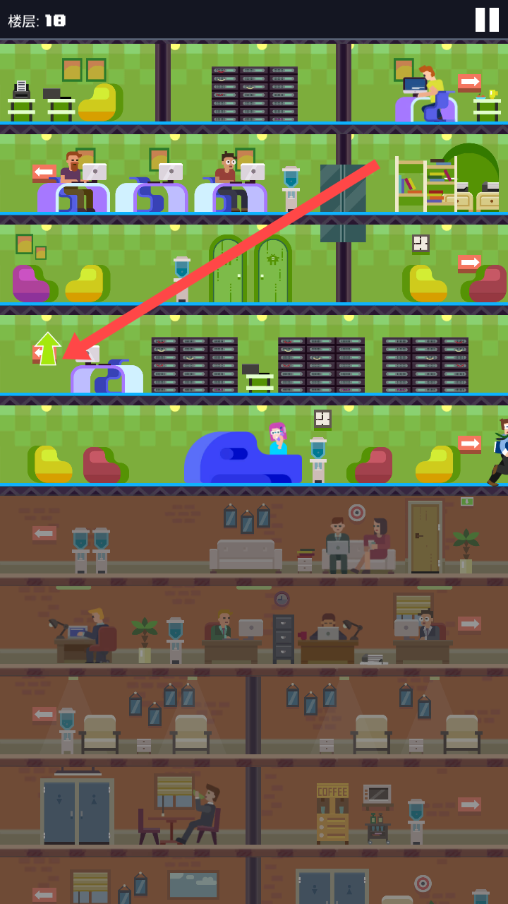 3、在跑到楼层18层,你依照箭头找到【绿色向上箭头】,这是通往下一层的关键交互元素。