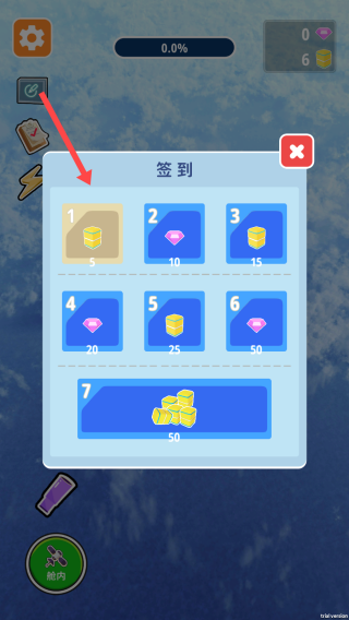 2、在游戏主界面,点击【箭头】所指的签到图标,打开签到界面,领取每日签到奖励。