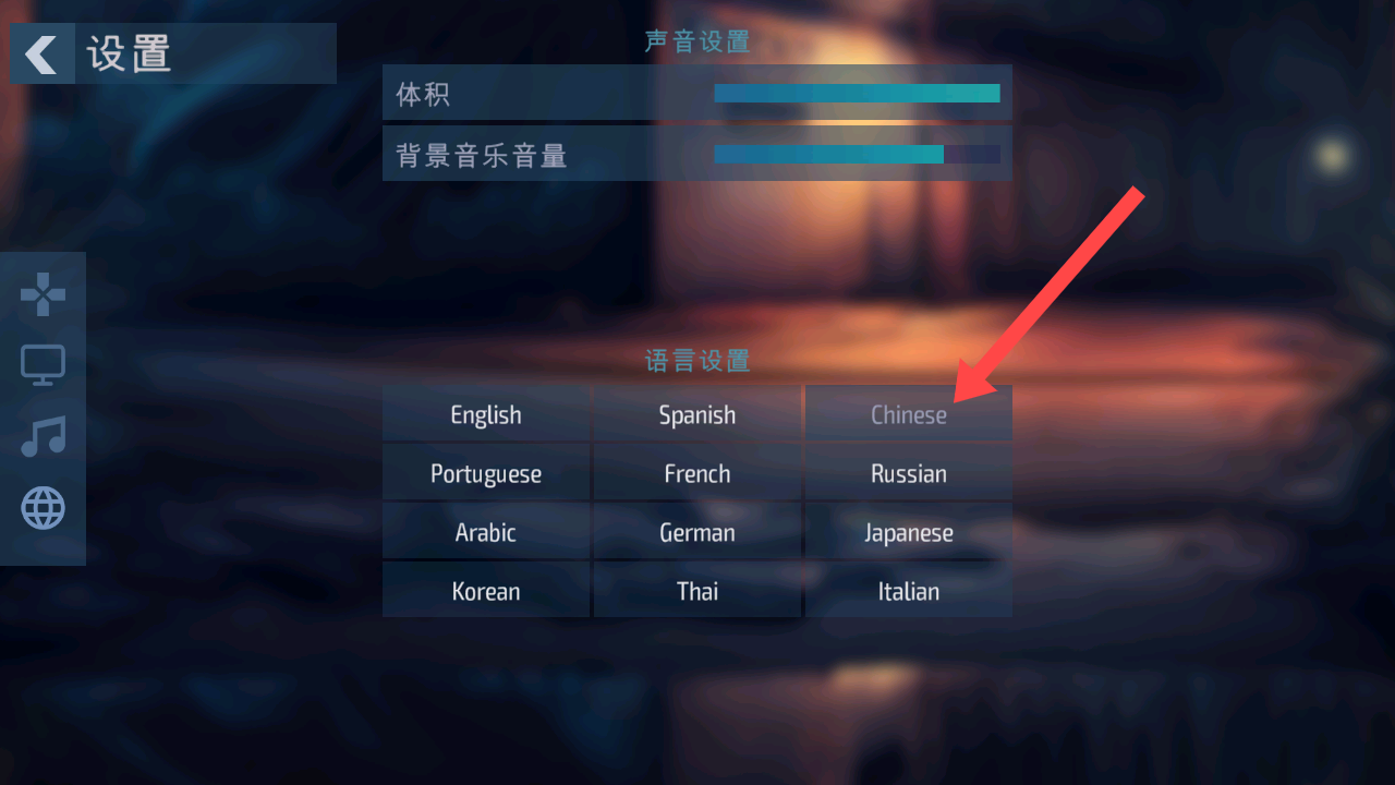 1、进入游戏后点击左上角齿轮,下拉到底可以设置中文,然后返回主页面点开始游戏。