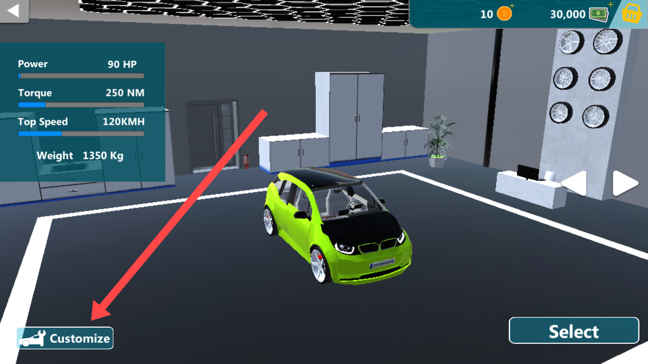 2、在车库中可以选购车型,点击左下角按钮可对选中的车型进行改装。