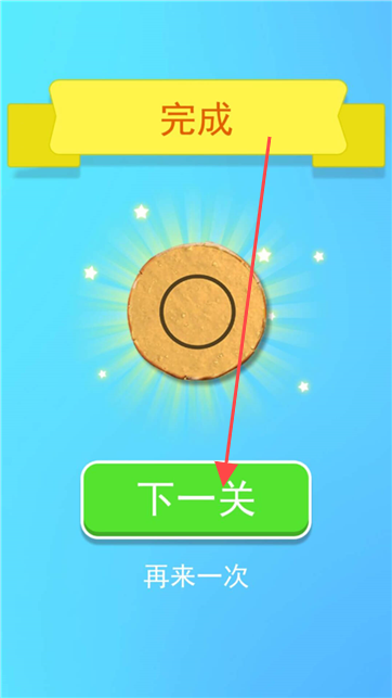 2、图案制作完成后,界面显示【完成】,此时按箭头指向点击【下一关】按钮,进入下一轮游戏挑战。