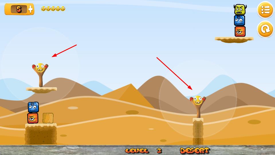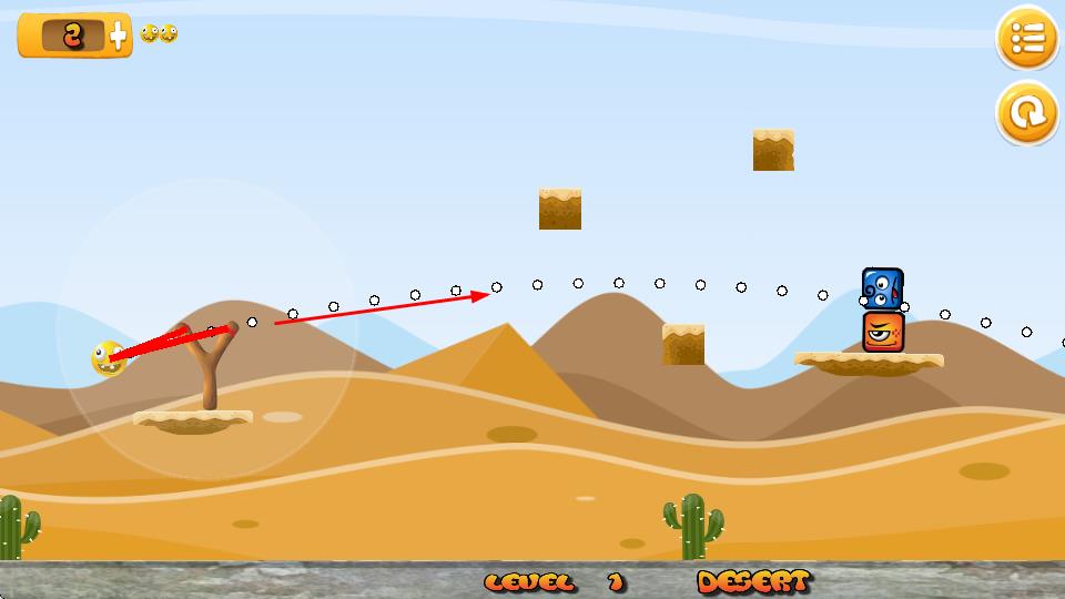 1、玩家操控弹弓,通过调整角度和力度,弹射黄色弹丸攻击悬浮平台上的彩色方块怪物。