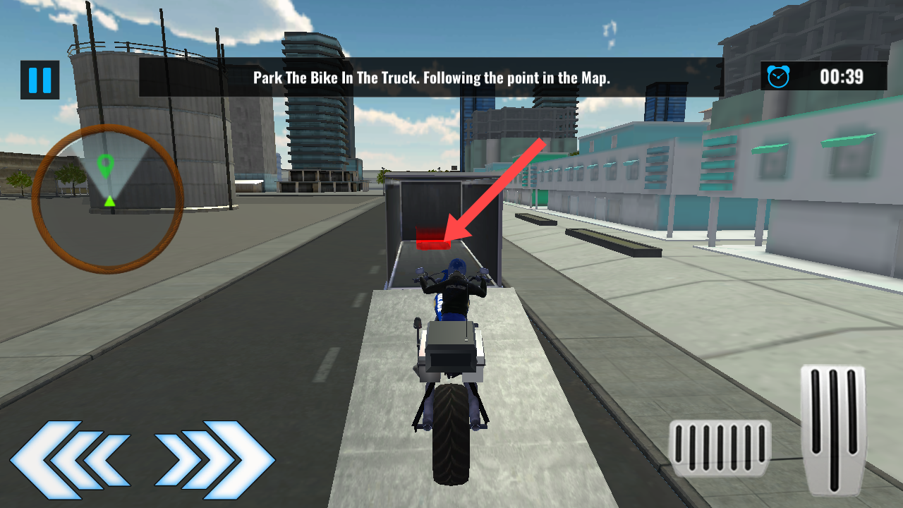 3、将摩托车驾驶至卡车处,对准卡车内部的红色区域,完成ParkTheBikeInTheTruck的任务要求。