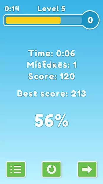 3、完成关卡后,查看等结果信息,点击箭头所指的绿色【右箭头按钮】,进入下一关卡,持续体验游戏挑战。