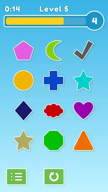 2、在【Level5】等关卡中,关注顶部的时间及进度条(如显示4),集中注意力快速选择正确图形,确保符合游戏要求。