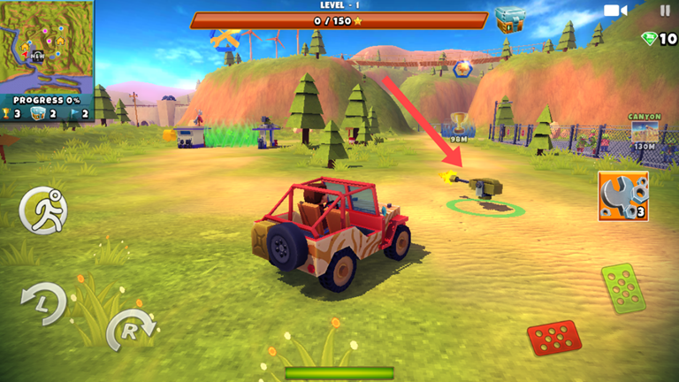 2、点击左下角发光的轮胎标志,进入游戏后首先找到武器装备到车上。