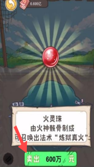 2、在物品界面,若确定不需要“火灵珠”,点击【箭头】所指的【卖出】按钮,获取600万元收益。