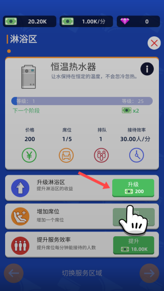 3、在淋浴区设施界面,当资源足够时,点击【箭头】所指的【升级】按钮,花费200资源升级淋浴区,提升收益和服务能力。