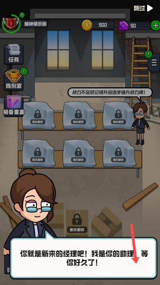 1、在游戏开场对话界面,点击【箭头】所指的箭头按钮,推进对话,了解游戏背景和任务提示。