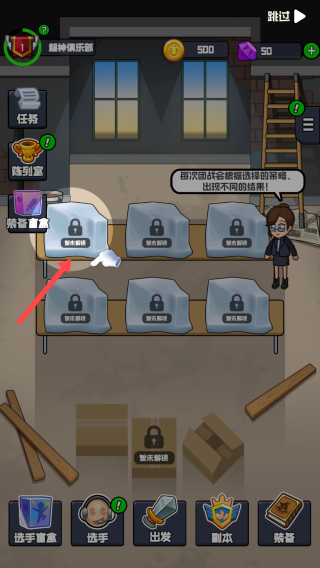 2、在选手管理界面,点击【箭头】所指的“新手拳击手套”等装备,可能涉及装备查看、解锁或使用操作。