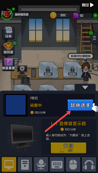 3、在选手替换界面,当需要调整阵容时,点击【箭头】所指的【替换选手】按钮,进行选手更换操作,优化团队配置。