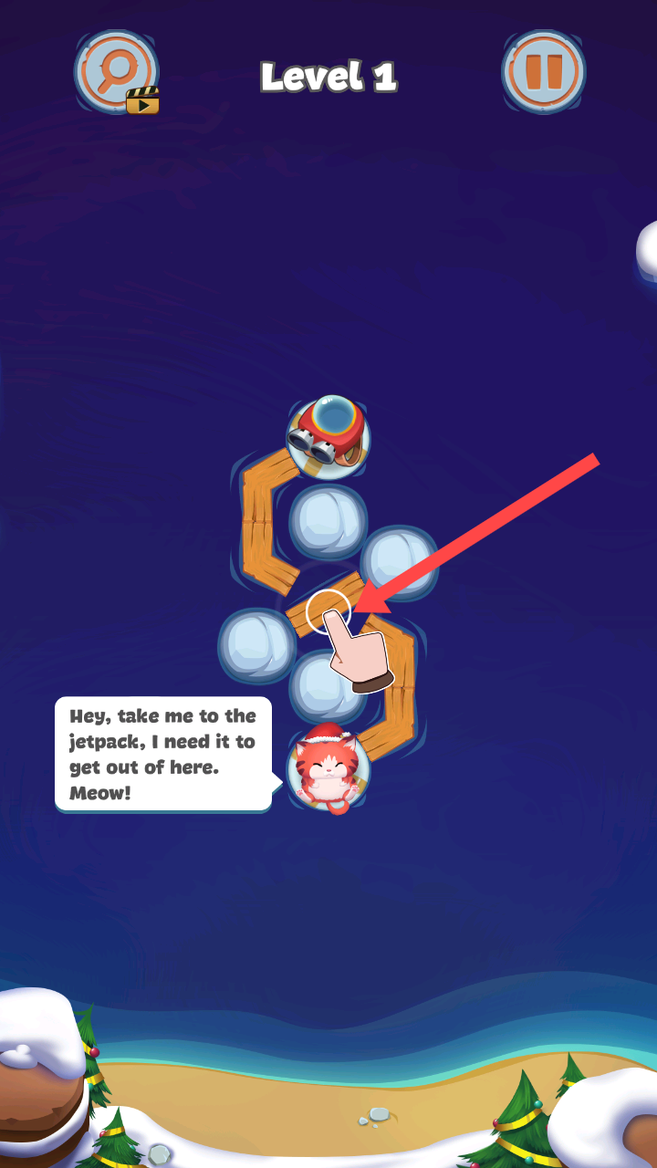 2、在游戏的关卡中按箭头指示滑动木板,为小猫咪开辟新的路径,使其抵达喷气背包。
