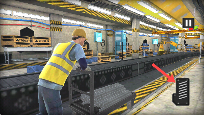 3、进入车间场景后,通过右下角的控制按钮操控角色进行相应操作,完成游戏任务。